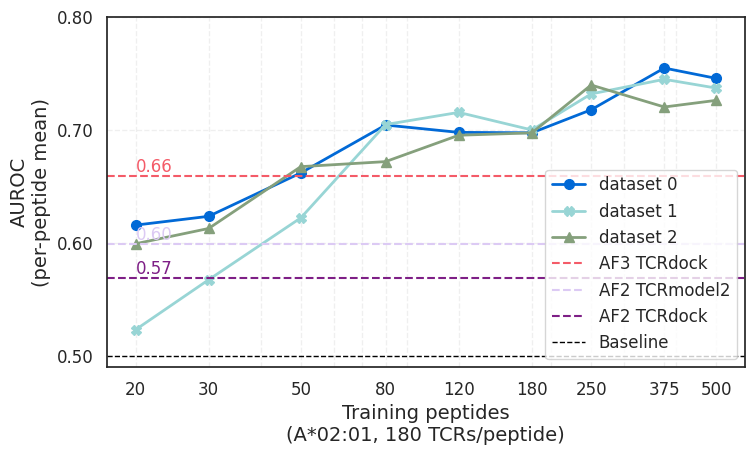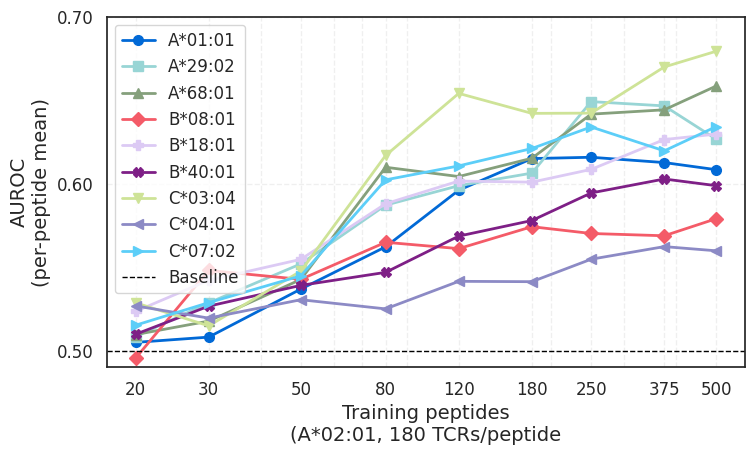 A second finding was the consistency with which model performance improved as training data increased. The study reports performance gains as both the number of peptides increased and as the number of TCRs observed per peptide increased.